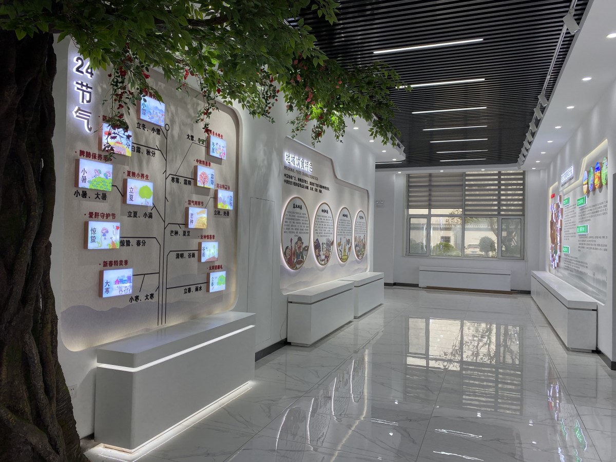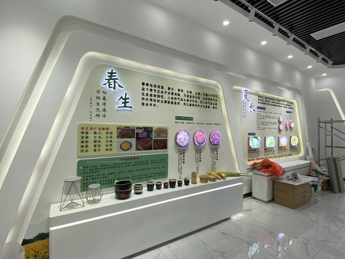 自然質樸的材質搭配、柔和的光環境(如色溫3000K-4000K的動態調節)以及香薰系統的運用,共同營造出溫馨舒適的氛圍。這種對觸覺、視覺、嗅覺的精密計算,使顧客停留時間延長,記憶留存率提升,從而加深對健康生活方式的認同。?展廳通過優化動線規劃與視覺焦點布局,提升運營效率。將傳統粥文化與粗糧養生理念進行當代詮釋。通過場景化復現傳統飲食技藝,如現場研磨演示與養生粥品體驗,實現文化符號的在地性表達,使品牌溢價空間擴大。?