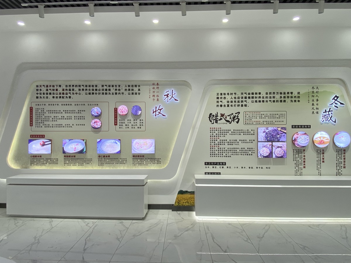 豐之坊展廳的設計以健康生活為核心,通過空間敘事構建品牌價值,產品陳列區以五谷磨房系列、特色粥體驗區等模塊展示食材原真性,而體驗區則通過粗糧互動演示、健康顧問指導等方式,使顧客在參與中理解粗糧養生的科學依據,這種“從產品到場景”的敘事邏輯強化了品牌的專業形象。?